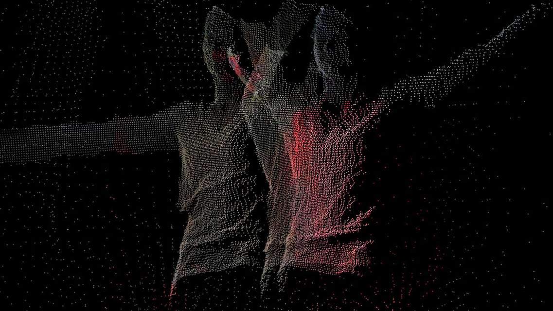 The visual component of the piece Orishas was created using custom code in Processing using a Kinect sensor and a webcam to transform the spatial, color and brightness information of choreographed dancers into a virtual three dimensional mathematical representation of their movements. 28000 images are then imported into a video editing software and treated as a still frame animation. The biggest challenge both in the choreography and the video making process was how to preserve the spirituality of the piece in such a logical setup. The solution was a collective leap of faith, embracing the limitations of the technology and approaching ritual repetitive gestures as the building blocks of a spiritual dance.